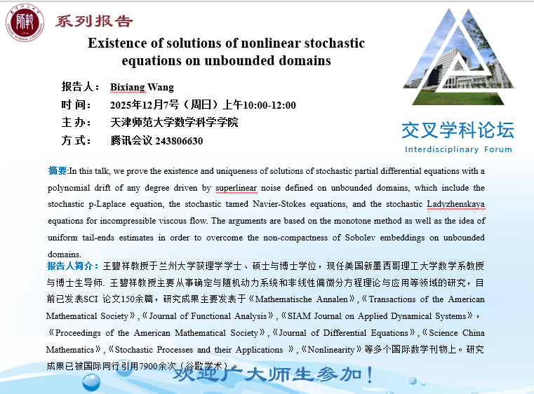【预告】学术报告(2025-25)12月7日--Existence of solutions of nonlinear stochasticequations on unbounded domains